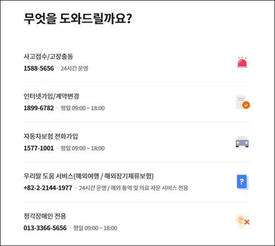 - 전화 시 필요한 정보: 피보험자 또는 계약자의 생년월일, 차량번호, 휴대전화번호 등