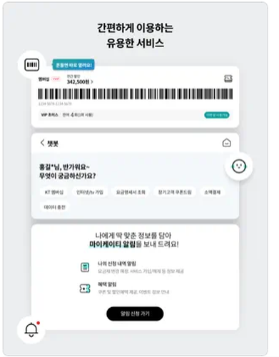 이 앱은 KT 상품 가입자라면 누구나 무료로 사용할 수 있으며, 로그인 후 개인 맞춤형 서비스를 이용할 수 있습니다.